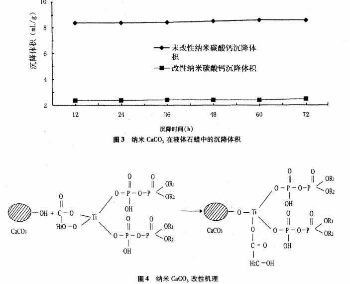 本文采用鈦酸酯偶聯(lián)劑對納米CaCO3 進行濕法表面改性, 通過活化度和吸油值的表征確定了改性劑的最佳用量, 采用沉降體積表面物化性能評價了納米碳酸鈣表面改性效果的好壞。