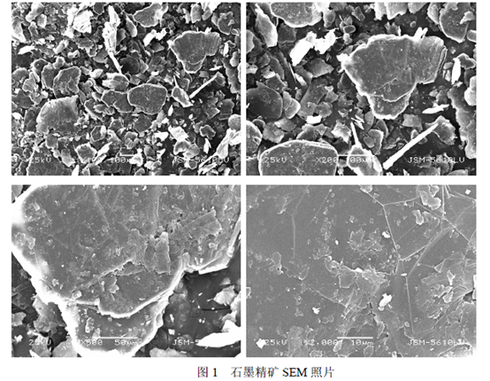 SEM 照片顯示石墨顆粒大小不均,最大0.350mm 左右,大多數(shù)顆粒粒度在0.08mm 以上。石墨鱗片結(jié)晶較好,片層表面有小片石墨粘結(jié),部分鱗片邊緣被磨圓,表明鱗片受到了較強(qiáng)的磨剝。有很少量細(xì)小亮色雜質(zhì)礦物顆粒附著與石墨晶體表面。
