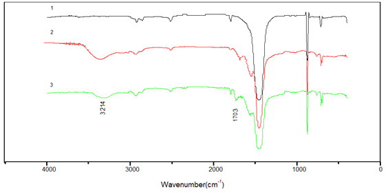1、未改性的輕質(zhì)CaCO3;2、經(jīng)配方1改性的CaCO3;3、經(jīng)配方2改性的CaCO3