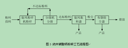 我公司在原有的粉碎、分級等設備的基礎上,通過對旋風粉碎機關鍵部件結構、分級機關鍵部件結構、成套生產(chǎn)線組合方式創(chuàng)新改進,結合納米碳酸鈣的自身特性,通過PLC控制系統(tǒng)控制,研發(fā)了粉碎分散成套設備。生產(chǎn)線以旋風粉碎機、分級機為核心,通過高壓風機負壓輸送,通過旋風粉碎機進行粉碎,通過分級機進行篩分,使各部件運行情況實現(xiàn)有序控制,有效提高了設備生產(chǎn)效率和產(chǎn)量、降低了運行能耗、降低了設備故障率、保證了生產(chǎn)產(chǎn)品的質量和實現(xiàn)了清潔生產(chǎn)。生產(chǎn)線樣機實物圖見圖2,工藝流程示意圖見圖3。