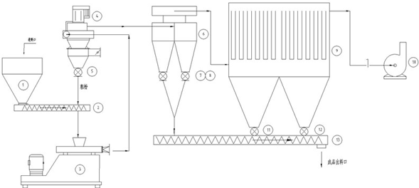 生產(chǎn)線整合了粉碎系統(tǒng)和分級系統(tǒng),使粉碎和分級串聯(lián)共用一套集料、除塵、引風系統(tǒng)。采用PLC控制,通過自動調節(jié)分級機上配套的風量調節(jié)器,調整引風機產(chǎn)生的真空度,進而調節(jié)分級機的篩分效果,實現(xiàn)一臺分級機上可達到不同的篩分效果;同時,通過優(yōu)化分級機和粉碎機的部件結構,將分級機出料口與粉碎機通過卸料閥直接連接在一起,使分級機出來的不合格物料可以直接重新回到粉碎機進行粉碎。使得生產(chǎn)線僅需配套一套粉碎+分級裝置即可完成產(chǎn)品生產(chǎn)的需要,整個過程可處于密封階段,無粉塵污染,且提高了生產(chǎn)效率,大大簡化了設備組成,降低了設備能耗,提高了設備運行的穩(wěn)定性。
