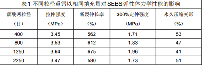 1. 隨著碳酸鈣粒徑的變小,彈性體的各種力學(xué)性能有所提升,但超過2250目時(shí),由于團(tuán)聚想象的出現(xiàn),力學(xué)性能反而降低;