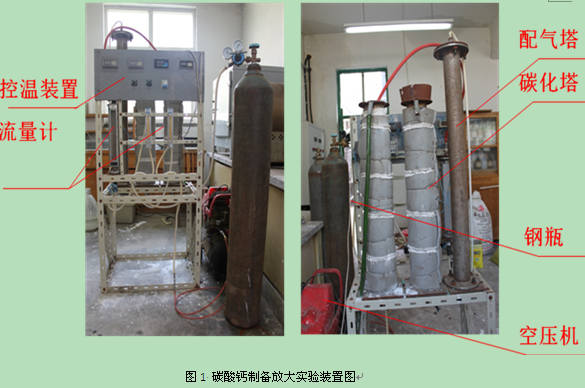 本論文在小試實(shí)驗(yàn)的基礎(chǔ)上,進(jìn)行碳酸鈣形態(tài)控制中試實(shí)驗(yàn)研究工作。實(shí)驗(yàn)室中試實(shí)驗(yàn)采用自制間歇鼓泡碳化反應(yīng)裝置,設(shè)有水浴加熱裝置、配氣塔、碳化塔和控溫裝置。碳化塔內(nèi)徑為97mm,塔外設(shè)有加熱保溫設(shè)施,用以滿足不同初始碳化溫度的實(shí)驗(yàn)需要,同時(shí)給碳化塔內(nèi)物料提供熱量并起到保溫的作用。詳見圖1.