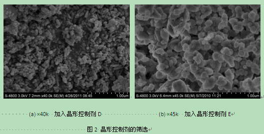 生產(chǎn)特定形貌碳酸鈣需要在碳化過程中加入晶型控制劑,首先應(yīng)對晶型控制劑進(jìn)行篩選。為了考察晶形控制劑種類對碳酸鈣形貌的影響,確定的碳化條件為:氫氧化鈣懸濁液的質(zhì)量分?jǐn)?shù)為13%、總加料量為2.5L、空塔氣速為0.038m/s、初始碳化溫度為30℃左右。在進(jìn)行多達(dá)十余種晶型控制劑實(shí)驗(yàn)和篩選的基礎(chǔ)上,初選出兩種較好的控制劑:晶型控制劑D和E。圖2是加入2%晶形控制劑D和2%晶形控制劑E(以生成的CaCO3質(zhì)量為基準(zhǔn))的納米碳酸鈣產(chǎn)品形貌。