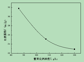 由圖4可以得知:隨著石灰乳濃度的增大,碳化產(chǎn)物的顆粒粒徑增大,比表面積減小。考慮到Ca(OH)2乳液的濃度對碳化裝置的生產(chǎn)能力有著明顯的影響,當(dāng)石灰乳濃度過低時(shí)明顯對設(shè)備要求相對提高,所以應(yīng)該從技術(shù)、經(jīng)濟(jì)兩個(gè)角度權(quán)衡,選擇86g/L的氫氧化鈣濃度制備納米碳酸鈣較適宜。