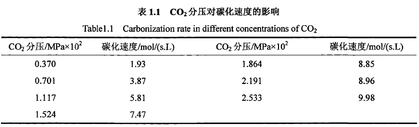 從熱力學(xué)角度來看,溫度升高,體系中CO2溶解度和Ca(OH)2的溶度積都降低,降低液相中的過飽和度,晶體的成核與生長速率降低,不利于碳化反應(yīng)的進(jìn)行。而且碳化過程是一個(gè)放熱反應(yīng),因此溫度升高時(shí),平衡左移;但從動(dòng)力學(xué)角度分析,溫度升高,加速了CO2與OH-生成CO32-的反應(yīng),并且提高了整個(gè)擴(kuò)散步驟的傳質(zhì)系數(shù),這對提高碳化速度是有利的。