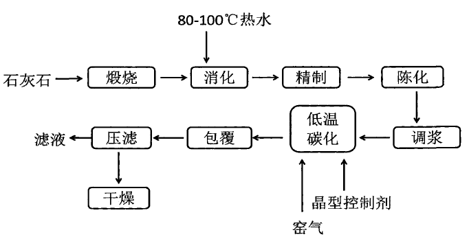 將煅燒好的生石灰按一定的水灰比加入到高溫的熱水中消化,得到的粗漿精制處理后經(jīng)陳化得到精制的石灰乳,然后石灰乳加水調(diào)濃調(diào)溫后粟進(jìn)碳化爸中,加入合適的晶型控制劑,控制碳化起始溫度,通入凈化處理的窯氣進(jìn)行碳化反應(yīng)得到納米碳酸鈣漿料;將漿料加熱至高溫,加入溶解的硬脂酸鈉包覆劑對納米碳酸鈣進(jìn)行活化處理,最后經(jīng)過壓濾、干燥、粉碎工序后,進(jìn)入包裝車間進(jìn)行包裝。根據(jù)不同應(yīng)用領(lǐng)域?qū)Ξa(chǎn)品的要求,控制反應(yīng)工藝條件、晶型控制劑的種類和用量,即可得到不同晶型和粒徑的碳酸鈣顆粒。