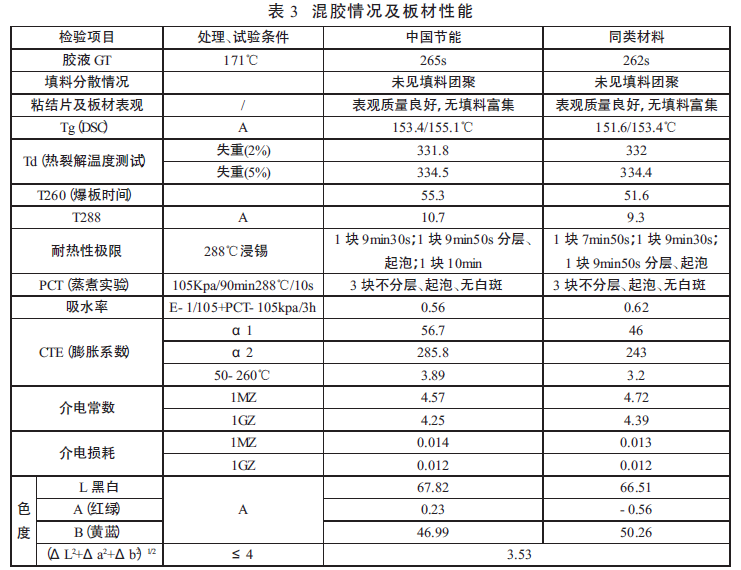 由表3 可知,覆銅板廠家選用江西中節(jié)能公司公司的復(fù)合型硅微粉作填料,產(chǎn)品在耐熱性、吸水率和介電常數(shù)等方面具有非常大的優(yōu)勢,但中節(jié)能硅微粉的膨脹系數(shù)偏高,經(jīng)過技術(shù)改進(jìn),目前已經(jīng)使膨脹系數(shù)達(dá)到同類產(chǎn)品水平。