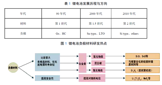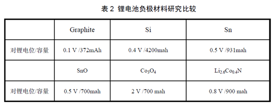 從目前已經(jīng)較為成熟的應(yīng)用及研究前景看,能應(yīng)用于鋰電池負(fù)極材料經(jīng)歷了如下的階段,并大體分為以下幾種(見表1,2 和圖1):