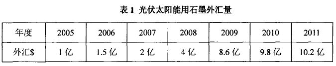 隨著光伏行業(yè)的快速發(fā)展, 促進了生產(chǎn)中重要的原輔材料高純石墨的用量大幅攀升, 國內(nèi)對高純石墨制品的生產(chǎn)技術(shù)還在起步階段, 大部分材料依靠進口然后再加工來完成近年來光伏太陽能用石墨外匯量如表1所示: