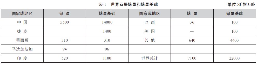 世界上已發(fā)現(xiàn)的大中型石墨礦床主要分布在中國(guó)、印度、巴西、捷克、加拿大和墨西哥等國(guó)。根據(jù)美國(guó)地質(zhì)勘探局資料,世界石墨儲(chǔ)量為7100 萬(wàn)噸(表1),中國(guó)石墨儲(chǔ)量為5500 萬(wàn)噸,占世界的77%。