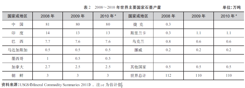2010 年世界天然石墨產(chǎn)量為110 萬(wàn)噸(表2)。中國(guó)石墨產(chǎn)量為80 萬(wàn)噸(晶質(zhì)石墨和隱晶質(zhì)石墨),占世界產(chǎn)量的73%。