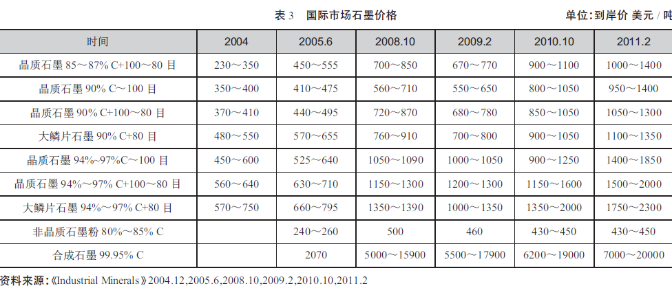 (4)國(guó)際市場(chǎng)石墨價(jià)格上漲,一方面是因?yàn)槭澜绺咝录夹g(shù)產(chǎn)業(yè)發(fā)展對(duì)石墨需求增加,另一方面是因?yàn)閮?yōu)質(zhì)大、中鱗片石墨資源稀少,為了避免發(fā)生類(lèi)似我國(guó)鋼鐵企業(yè)缺少鐵礦一樣的困境,呼吁石墨礦山企業(yè)和石墨制品企業(yè)要十分珍惜我國(guó)石墨資源,自覺(jué)控制石墨開(kāi)采量,自覺(jué)提高石墨資源的利用效率。