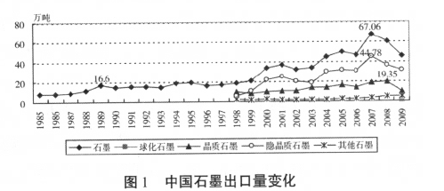 世界上有60 個(gè)國(guó)家和地區(qū)進(jìn)口石墨,進(jìn)口量超過(guò)萬(wàn)噸的主要是日本、美國(guó)、韓國(guó)、荷蘭、德國(guó)、意大利、英國(guó)、新加坡和印度尼西亞等,美國(guó)有90 個(gè)石墨制品企業(yè),天然石墨完全依靠進(jìn)口。中國(guó)、巴西和加拿大等10多個(gè)國(guó)家出口天然石墨。1981 年中國(guó)石墨出口5.94 萬(wàn)噸,1989 年增加到16.6 萬(wàn)噸,年均增長(zhǎng)14%。由于中國(guó)石墨過(guò)量出口,國(guó)際市場(chǎng)石墨價(jià)格大幅度下降,1993~2004 年國(guó)際市場(chǎng)石墨價(jià)格在谷底徘徊,幾乎接近成本價(jià),大部分外國(guó)石墨企業(yè)停產(chǎn),這期間國(guó)際市場(chǎng)天然石墨90%來(lái)源于中國(guó)。1981~2009 年中國(guó)石墨出口累計(jì)700 萬(wàn)噸,2007 年中國(guó)石墨出口量達(dá)到歷史最高,為67.06 萬(wàn)噸(圖1),受金融危機(jī)影響,2008 年和2009 年石墨出口量下降。2009 年中國(guó)出口石墨增加了一種新產(chǎn)品———球化石墨,全年出口天然石墨45.89萬(wàn)噸,其中:鱗片石墨9.76 萬(wàn)噸,隱晶質(zhì)石墨30.85 萬(wàn)噸,球化石墨0.68 萬(wàn)噸,其他石墨4.6 萬(wàn)噸。目前中國(guó)石墨出口量占世界的比重大于85%。