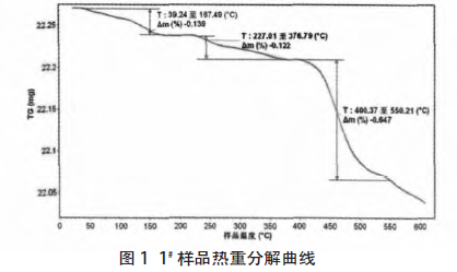 選取兩種不同改性劑包覆的樣品進行熱重試驗,結(jié)果見圖1、圖2。從實驗結(jié)果看:1# 樣品在溫度范圍39.24℃~167.49℃出現(xiàn)一次失重?zé)岱纸?,失重率?.14%,顆粒表面的吸附水脫出;227.00℃~376.79℃出現(xiàn)第二次失重,應(yīng)是因庫侖力物理吸附在碳酸鈣粉體表面的偶聯(lián)劑脫出,失重率為0.12%;400.37℃~550.21℃出現(xiàn)第三次失重,偶聯(lián)劑與碳酸鈣之間的化學(xué)鍵發(fā)生斷裂、分解脫出,失重率為0.65%;自550.21℃后碳酸鈣開始分解。