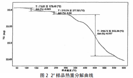 2#樣品在溫度范圍73.81℃~179.48℃出現(xiàn)一次失重?zé)岱纸猓е芈蕿?.045%,顆粒表面的吸附水脫出;215.79℃~277.52℃出現(xiàn)第二次失重,應(yīng)是因庫侖力物理吸附在碳酸鈣粉體表面的改性劑脫出,失重率為0.04%;310.72℃~552.30℃出現(xiàn)第三次失重,改性劑與碳酸鈣之間的化學(xué)鍵發(fā)生斷裂、分解脫出,失重率為0.56%;自550.21℃后碳酸鈣開始分解。