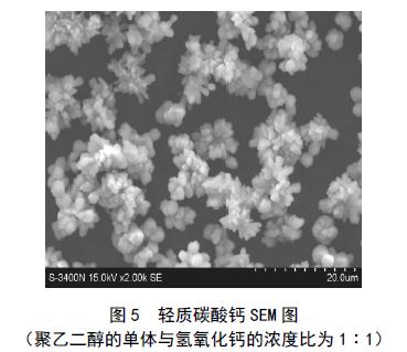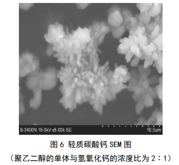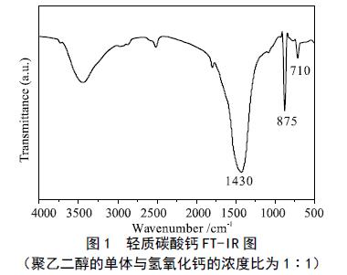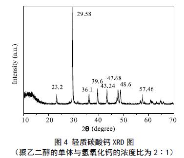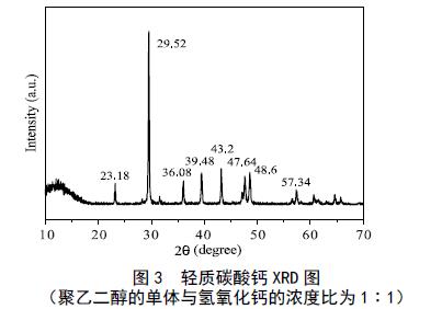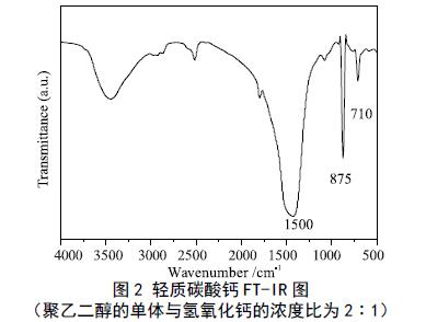 (1)以碳酸鈉為碳源,利用碳化法成功制備了一種面心立方結(jié)構(gòu)的輕質(zhì)碳酸鈣,制備過程中使用聚乙二醇為分散劑。