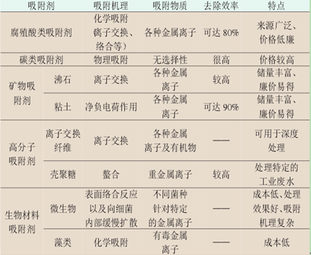 針對(duì)不同的水處理方法,開發(fā)了不同用途的環(huán)境凈化材料。目前,用于廢水分離工藝技術(shù)中,最為重要的一類就是吸附劑。表1中列出了目前水處理吸附工藝中常用的吸附劑及其特點(diǎn)。