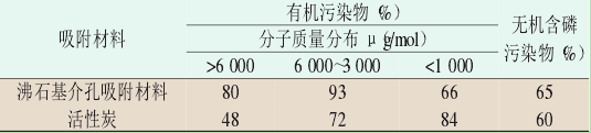 天然沸石由于來(lái)源廣泛、處理效果好、不產(chǎn)生二次污染等優(yōu)點(diǎn),目前已逐漸替代傳統(tǒng)的活性炭吸附劑成為主要的水處理吸附劑。目前對(duì)于天然沸石的研究主要集中在通過(guò)物理化學(xué)方法對(duì)材料的表面性質(zhì)進(jìn)行改性,制備介孔復(fù)合體材料,降低其制備成本以及進(jìn)一步提高吸附效率??茖W(xué)家利用天然沸石作為基體,在分子尺度范圍內(nèi)可控地破壞孔洞結(jié)構(gòu),進(jìn)行造孔,制得了一種新型介孔復(fù)合吸附材料。表2為該法制備的介孔復(fù)合吸附材料與優(yōu)質(zhì)顆?;钚蕴繉?duì)于同種污水中有機(jī)污染物和極性含磷無(wú)機(jī)污染物的去除率的對(duì)比。