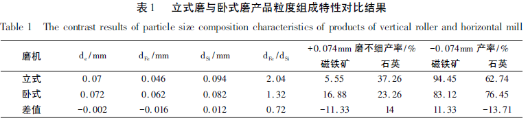 段希祥等選用350 × 600mm 的立式細磨機和420 ×420mm 的傳統(tǒng)臥式細磨機,同時處理1 ~ 0.5mm 的石英和磁鐵礦混合料,混合比例為石英和磁鐵礦各占50%,磨碎試驗結果見表1。