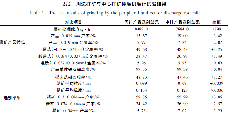 段希祥等對廣西的錫礦石進行了周邊排料磨和中心排料磨磨碎對比試驗,試驗結果見表2.