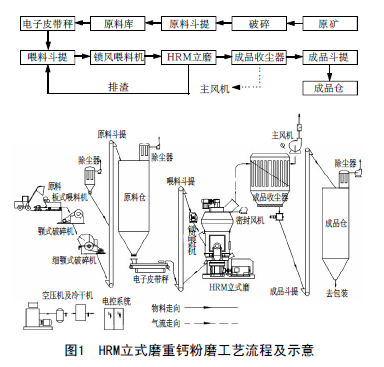 HRM立式磨重鈣粉磨工藝流程及示意圖如圖1所示。