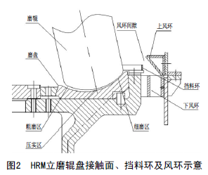 輥盤磨損問題對于細度要求高的成品來說,產(chǎn)能驟降更加容易體現(xiàn)。此時,宜對輥套進行調(diào)面處理,重新堆焊(堆焊輥套適用)或者更換新的輥套和磨盤襯板(產(chǎn)能降低10%以上就應(yīng)該考慮以上措施)。HRM立磨輥盤接觸面、擋料環(huán)及風(fēng)環(huán)示意如圖2所示。