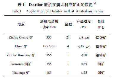 Detritor 立式攪拌磨機(jī)采用立式布置的優(yōu)點(diǎn)在于,完全利用磨機(jī)本體來(lái)支撐動(dòng)力和傳動(dòng)系統(tǒng),使設(shè)備占地面積小、基礎(chǔ)更加簡(jiǎn)單。此外,采用立式布置,還可節(jié)省料漿密封裝置或降低給料口壓力。Detritor 磨機(jī)規(guī)格從7. 5 kW 到1 100 kW 不等,據(jù)統(tǒng)計(jì)全球現(xiàn)有149 臺(tái)在運(yùn)行,總安裝功率4. 5 萬(wàn)kW。其中355 kW 的Detritor 磨機(jī)是目前最成熟、市場(chǎng)應(yīng)用最廣泛的,其處理量約20 t /h。Detritor磨機(jī)在澳大利亞的應(yīng)用情況如表1 所示。