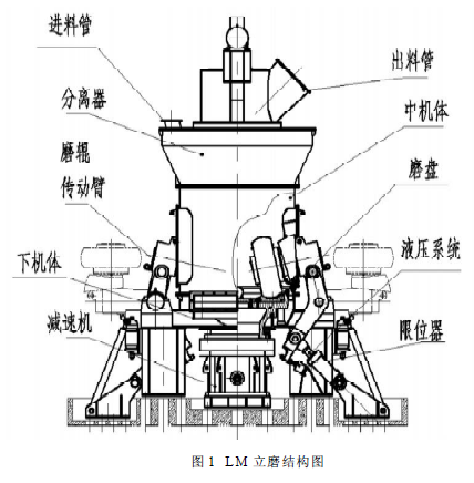 (1)LM 型立磨的結(jié)構(gòu)立式磨基本有減速機(jī)、機(jī)體、磨輥磨盤、分離器、傳動(dòng)臂、機(jī)架、液壓缸、限位器等幾部分組成。設(shè)備結(jié)構(gòu)詳見圖1。