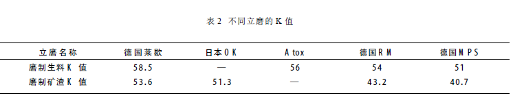 礦渣和石英在化學(xué)成分及易磨功指數(shù)上相差不大,都在20~25kW/t范圍內(nèi),石英微粉的成品細(xì)度要比礦渣要求略高。因此我們?cè)O(shè)計(jì)的石英立式磨的K 值也要象磨礦渣那樣采用比生料磨的K值小20%,石英立磨的磨盤轉(zhuǎn)速比同類型同規(guī)格的生料磨要低20%左右,確定用于這類物料在此細(xì)度要求的情況下,磨盤轉(zhuǎn)速為38 轉(zhuǎn)/ 分。