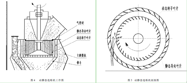 分離器的主要功能是將合格的物料及時(shí)分離出來(lái)。傳統(tǒng)磨機(jī)生產(chǎn)200目以下較粗的石英粉的時(shí)候,所用的是普通的動(dòng)態(tài)選粉機(jī),這種選粉機(jī)雖然效率比較高,但是不適合更細(xì)的石英微粉產(chǎn)品的分級(jí)。我們認(rèn)真仔細(xì)地研究分析了當(dāng)今先進(jìn)的高效組合式選粉機(jī),如LV 選粉機(jī)、O-sepa選粉機(jī)、SLS 選粉機(jī)等,結(jié)合我公司多年超細(xì)微粉磨的設(shè)計(jì)生產(chǎn)經(jīng)驗(yàn),最終設(shè)計(jì)出適合石英立式磨分離器(動(dòng)靜態(tài)組合式選粉機(jī)),重點(diǎn)考慮選粉區(qū)域部分以及顆粒運(yùn)動(dòng)的控制,調(diào)整了動(dòng)態(tài)轉(zhuǎn)子與導(dǎo)向葉片的間距、動(dòng)態(tài)轉(zhuǎn)子轉(zhuǎn)速、導(dǎo)向葉片片數(shù)和幾何尺寸、并且對(duì)轉(zhuǎn)子采用氣密封結(jié)構(gòu),能有效地避免大顆粒進(jìn)入成品,從而降低循環(huán)負(fù)荷,提高研磨效率。物料在分離器中分離示意見圖4 和圖5。