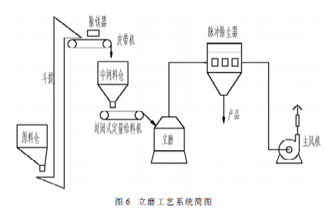 石英粉磨工藝系統(tǒng)流程如圖6,簡(jiǎn)述如下:經(jīng)過(guò)破碎的粒狀石英儲(chǔ)存在原料倉(cāng)中,倉(cāng)下裝有閥門,經(jīng)斗式提升機(jī)提到工藝系統(tǒng)需要的高度后落到皮機(jī)上,經(jīng)最終除鐵后,落入中間料倉(cāng),在料倉(cāng)下部與封閉式定量給料機(jī)封閉相連接。且封閉是定量給料機(jī)與立磨也是封閉式連接,這樣中間料倉(cāng)中的物料,就很好的起到了鎖風(fēng)的介質(zhì)。封閉式定量給料機(jī)具有皮帶秤、輸送物料、配合鎖風(fēng)、定量給料的四大功能,在封閉式定盤的壽命。收塵器收集的石英粉成品經(jīng)輸送裝置送入石英粉倉(cāng),以備使用。