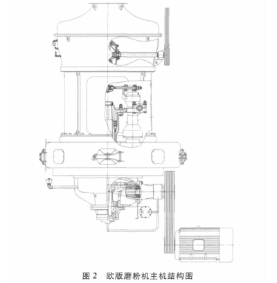 由圖可知, 重鈣制粉系統(tǒng)采用的設(shè)備為破碎機(jī)、提升機(jī)、電磁振動給料機(jī)、歐版磨粉機(jī)。歐版磨粉機(jī)整機(jī)結(jié)構(gòu)是由主機(jī)、高效選粉機(jī)、管道裝置、離心引風(fēng)機(jī)、隔離式旋風(fēng)集粉器、新型除塵器組成(圖2)。