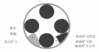 4)特殊磨輥及磨環(huán)結(jié)構(gòu)設(shè)計,曲面可換刀刃鏟刀(見圖3),使粉磨效率提高,使用成本降低。傳統(tǒng)磨機(jī)鏟刀刀刃磨損較快,鏟刀為整體鏟刀,刃部磨損后,需要整體更換鏟刀,浪費(fèi)材料,增加停機(jī)更換時間。MTW歐版磨粉機(jī)鏟刀刃部采用高耐磨合金材料, 使用壽命長,更換時只需更換刀刃部分,提高了材料利用率。另外, 傳統(tǒng)的平面型鏟刀將物料鏟起后堆積在一個層面上,使磨輥磨環(huán)中部磨損嚴(yán)重,曲面型鏟刀可將物料導(dǎo)向立面,使磨輥磨環(huán)上、中、下部都能粉磨,使其均勻磨損,同時也增大了有效工作面積,從而增加了產(chǎn)量。