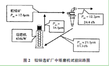 在選礦中塔磨機(jī)主要用在再磨回路中?當(dāng)磨機(jī)與小直徑旋流器成閉路和給料足夠細(xì)時(shí),塔磨機(jī)回路可產(chǎn)出很細(xì)的產(chǎn)品。塔磨機(jī)在鉛鋅選礦廠中的細(xì)磨實(shí)例如圖2 所示。塔磨機(jī)與直徑150 mm 旋流器成閉路。給礦粒度為F80= 17.4μm,磨礦產(chǎn)品粒度為P80 = 12.7μm。