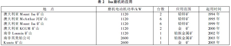 因?yàn)闆]有攔著介質(zhì)的篩網(wǎng),就不存在篩網(wǎng)堵塞問題,甚至在應(yīng)用低能力的磨礦介質(zhì)時(shí),Isa 磨機(jī)也具有很高的處理能力。工業(yè)規(guī)模的Isa 磨機(jī)所用的磨礦介質(zhì)有粒狀的銅和鉛冶煉渣、礦石礫石和各種砂。Isa 磨機(jī)在很多國家得到了應(yīng)用( 表2) 。最大的Isa 磨已配備2600 kW 電動(dòng)機(jī)。