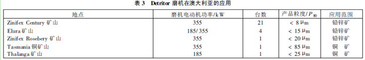 澳大利亞Zinifex Century 鋅礦山安裝了21 臺(tái)Detritor 磨機(jī),6 臺(tái)用于再磨,15 臺(tái)用于超細(xì)磨?在超細(xì)磨回路的Detritor 磨機(jī)前安裝了兩臺(tái)直徑為2英寸的旋流器。給礦粒度為F80= 34μm,磨礦產(chǎn)品粒度為P80= 6.6μm,其單位能耗為34-37 kWh/t。磨礦介質(zhì)是來自美國科羅拉多Springs 的直徑為1-2 mm 的砂子。也試驗(yàn)過用Yuleba 資源公司Ausone 公司的砂產(chǎn)品作為Det ritor 磨機(jī)的磨礦介質(zhì),但效果差一些?Detritor 磨機(jī)是一種比較小的磨機(jī)。最大的磨機(jī)安裝355 kW 的電動(dòng)機(jī)。Zinifex Century 鋅礦山安裝21 臺(tái)Det ritor 磨機(jī)( 每臺(tái)功率為355 kW) 才能達(dá)到所要求的處理能力,這給維修和控制造成了一定的問題。Detritor 磨機(jī)在澳大利亞的應(yīng)用實(shí)例如表3 所示。