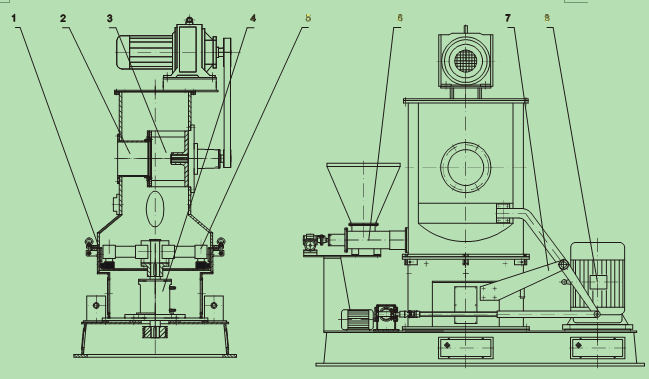 1—磨壁;2—出料口;3—分級裝置;4—主軸承座;5—磨輪;6—喂料裝置;7—翻轉(zhuǎn)裝置;8—主電機