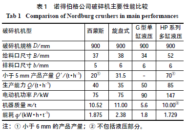 國(guó)內(nèi)外圓錐破碎機(jī)有許多類型,各型破碎機(jī)性能都不一樣,同一種機(jī)型,不同的生產(chǎn)廠家,其產(chǎn)品性能也會(huì)有所不同?,F(xiàn)就國(guó)內(nèi)已有的圓錐破碎機(jī)各機(jī)型與性能進(jìn)行比較,從中可以看出哪種破碎機(jī)的性能更優(yōu)越,進(jìn)而找出圓錐破碎機(jī)的發(fā)展方向。由于西蒙斯破碎機(jī)的性能遠(yuǎn)優(yōu)于傳統(tǒng)的彈簧式圓錐破碎機(jī),所以近年來(lái)國(guó)內(nèi)各破碎機(jī)制造廠紛紛開發(fā)這種破碎機(jī),國(guó)產(chǎn)傳統(tǒng)彈簧圓錐破碎機(jī)越來(lái)越少。近年來(lái),新制訂的彈簧圓錐破碎機(jī)國(guó)家標(biāo)準(zhǔn) (報(bào)批稿) 與西蒙斯圓錐破碎機(jī)的參數(shù)基本相近,故傳統(tǒng)彈簧圓錐破碎機(jī)遲早會(huì)被淘汰。表 1 給出了諾得伯格公司的西蒙斯、旋盤式、G型單缸液壓圓錐破碎機(jī)和 HP 系列多缸液壓圓錐破碎機(jī)的主要性能指標(biāo)。
