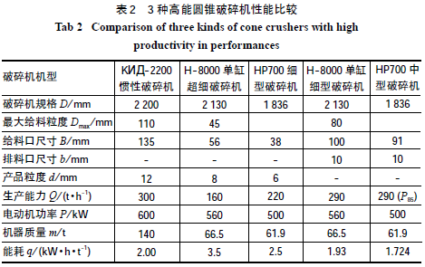 2 現(xiàn)有圓錐破碎機(jī)機(jī)型與性能比較