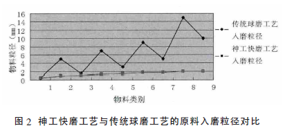 (1) 神工快磨工藝的入球(硬質(zhì)) 物料粒徑在2 mm(10 目)以下,物料間粒徑差異很小;傳統(tǒng)球磨工藝的入球物料粒徑在15 mm 以下,且物料間粒徑差異很大。