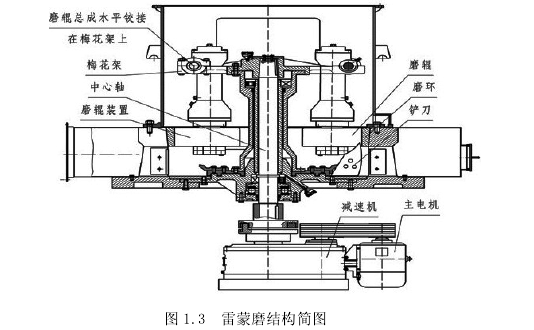 雷蒙磨又稱為懸輥式盤磨機,其的機構原理如圖1.3所示。其工作原理是利用主電機通過減速器帶動中心軸轉(zhuǎn)動,中心軸的上端與梅花架相連,磨輥通過水平鉸鏈與梅花架相連形成擺動支點,當梅花架帶動磨輥旋轉(zhuǎn)時,磨輥在離心力的作用下將緊緊地滾壓在磨環(huán)上,在摩擦力的作用下,磨輥將自轉(zhuǎn),對物料進行粉碎。用于鏟起物料的鏟刀安裝在梅花架的下部,在工作時,磨輥與鏟刀在一起轉(zhuǎn)動中,將物料鏟拋起來,并將物料填入磨輥和磨環(huán)之間,形成料層,料層將受到磨輥公轉(zhuǎn)時產(chǎn)生向外的離心力(即擠壓力)的作用,從而對物料進行粉碎。