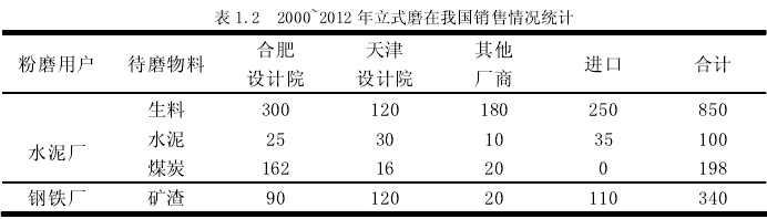 表1.2是我國2000~2012年間新建水泥項目立式磨的選用狀況,由此可知,2000 年前后立式磨在我國水泥行業(yè)的應用剛剛起步,所有的立式磨粉機都是從國外進口的,這種國內(nèi)立式磨依賴國外進口的情況持續(xù)到2007年才開始被國產(chǎn)立式磨所打破。