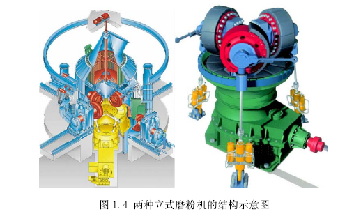 立式磨粉機在當今世界發(fā)展加快,走在在世界研制前沿的立式磨廠家有德國的非凡公、萊歇公司、伯利鳩斯公司、丹麥的史密斯公司以及日本的宇部等。如圖1.4為兩種不同類型的立式磨粉機結構示意圖。雖然各個公司生產(chǎn)的立式磨粉機的結構形式不同,但所有的立式磨粉機的粉磨原理是相同的。