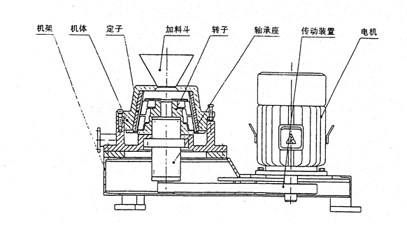 1、采用錐形的轉(zhuǎn)子與定子,通過(guò)升降上箱體(定子)即可調(diào)整轉(zhuǎn)子與定子的間隙來(lái)控制產(chǎn)品細(xì)度和產(chǎn)量,間隙調(diào)整范圍為0-5mm。