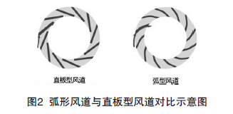 (3)傳統(tǒng)磨機中的磨粉機風道均為直板型風道,這種結(jié)構(gòu)存在氣流直接沖擊風道板而產(chǎn)生阻力,氣流分子間相互碰撞的能量損失大,易產(chǎn)生渦流導致風道堵塞等缺點。而弧形風道的風量損失小、物料流動性好。MTW歐版磨粉機所采用風道為曲面型風道,切向氣流進口順滑,阻力小,內(nèi)部出口方向有利于物料的分散,不容易堵料。弧形風道與直板型風道對比示意見圖2。