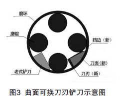 (4)特殊磨輥及磨環(huán)結(jié)構(gòu)設計為曲面可換刀刃鏟刀(見圖3),提高了粉磨效率,降低了使用成本。傳統(tǒng)磨機鏟刀刀刃磨損較快,鏟刀為整體鏟刀,刃部磨損后,需要整體更換鏟刀,浪費材料,增加停機更換時間。MTW歐版磨粉機鏟刀,刃部采用高耐磨合金材料,使用壽命長,更換時只需更換刀刃部分,提高了材料利用率。另外,傳統(tǒng)的平面型鏟刀,物料鏟起后堆積在一個層面上,使磨輥磨環(huán)中部磨損嚴重,曲面型鏟刀可將物料導向立面,使磨輥磨環(huán)上、中、下部都能磨粉,使其均勻磨損,同時也增大了有效工作面積,從而增加了產(chǎn)量。