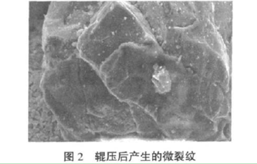 但同高壓輥磨機相比,在細碎作業(yè)和節(jié)能降耗上還有一定差距。高壓輥磨機在工作過程中擠壓力不僅作用于粗顆粒上,而且作用于各種大小的顆粒上,解決了傳統(tǒng)破碎機作用力只能作用于粗顆粒上的問題,所以高壓輥磨機的出料中的細粒級含量遠遠高于高性能細碎圓錐破碎機,它的破碎比要高于細碎圓錐破碎機,產(chǎn)生的細小顆粒內(nèi)部還產(chǎn)生了微裂紋(見圖2),可以提高物料的易磨性、降低邦德功指數(shù)和提高有用成分的回收率。