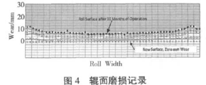 但嚴格禁止金屬異物進入兩輥之間。圖4 為Procemin2009 中介紹的智利CMH 公司鐵礦石破碎用RP170-180 高壓輥磨輥面負荷運行10 個月的檢測情況的記錄,完全滿足了高壓輥磨設備在礦業(yè)領域的應用。