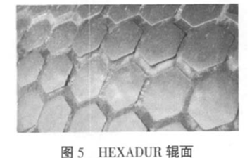 Koppern 公司推出的高溫高壓成型的菱形塊復合輥面HEXADUR(見圖5),菱形塊由冶金粉末制作。與柱釘輥面結(jié)構(gòu)相比最大的優(yōu)勢是承受的比壓強大,不會輕易發(fā)生斷裂問題,HEXADUR 輥面最高承受的比壓強達8 MPa。但由于很難形成料墊來保護輥面,使用壽命受到一定限制,同時由于受到高溫高壓成型設備的限制,制約了HEXADUR 輥面的直徑大型化應用。